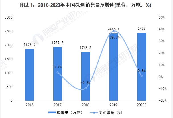 在我国涂料市场需求方面,由于涂料广泛应用于各种金属、木材、水泥、砖石、皮革、织物、塑料、橡胶、玻璃及纸张等制品表面,并且我国拥有庞大的房地产、汽车等行业体量,因此我国对于涂料需求的规模同样是非常大的。根据国家统计局的数据显示,2019年,我国涂料销售量为2416.1万吨,同比增长38.3%。初步计算,2020年我国涂料销售量约为2435万吨涂料在线coatingol.com。