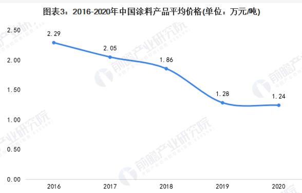 在激烈的竞争下,国内涂料行业的“价格战”越演越烈,导致行业产品整个价格出现下滑趋势。中国涂料工业协会数据显示,2016年,我国涂料行业产品平均价格为2.29万元/吨;到2020年,我国涂料行业产品平均价格降至1.24万元/吨。
